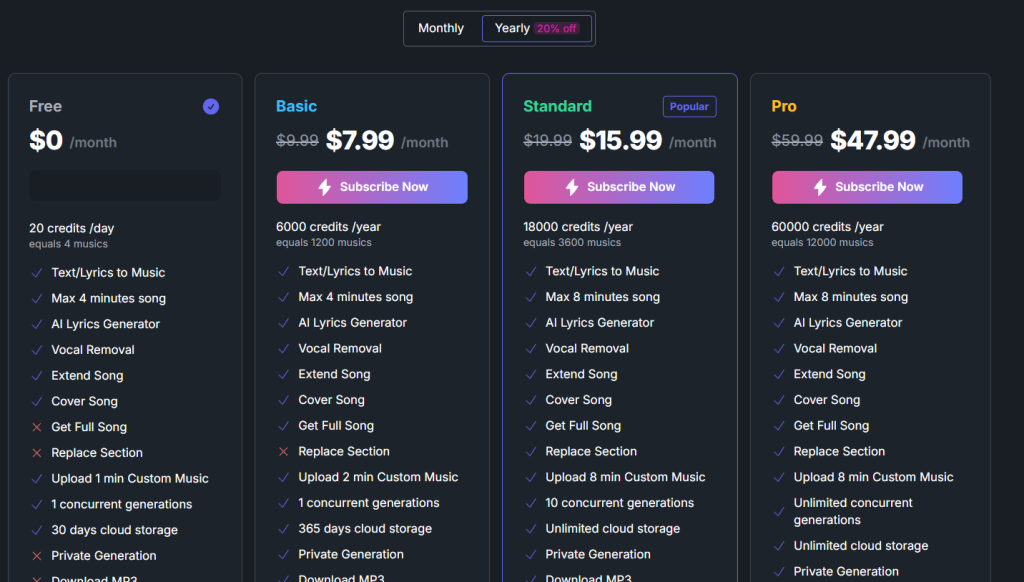 AI Song Maker offers different plans depending on your needs. Free trials or limited access may be available, allowing you to test before committing. Paid plans usually unlock higher-quality audio files, unlimited cloud storage, and more customization.
