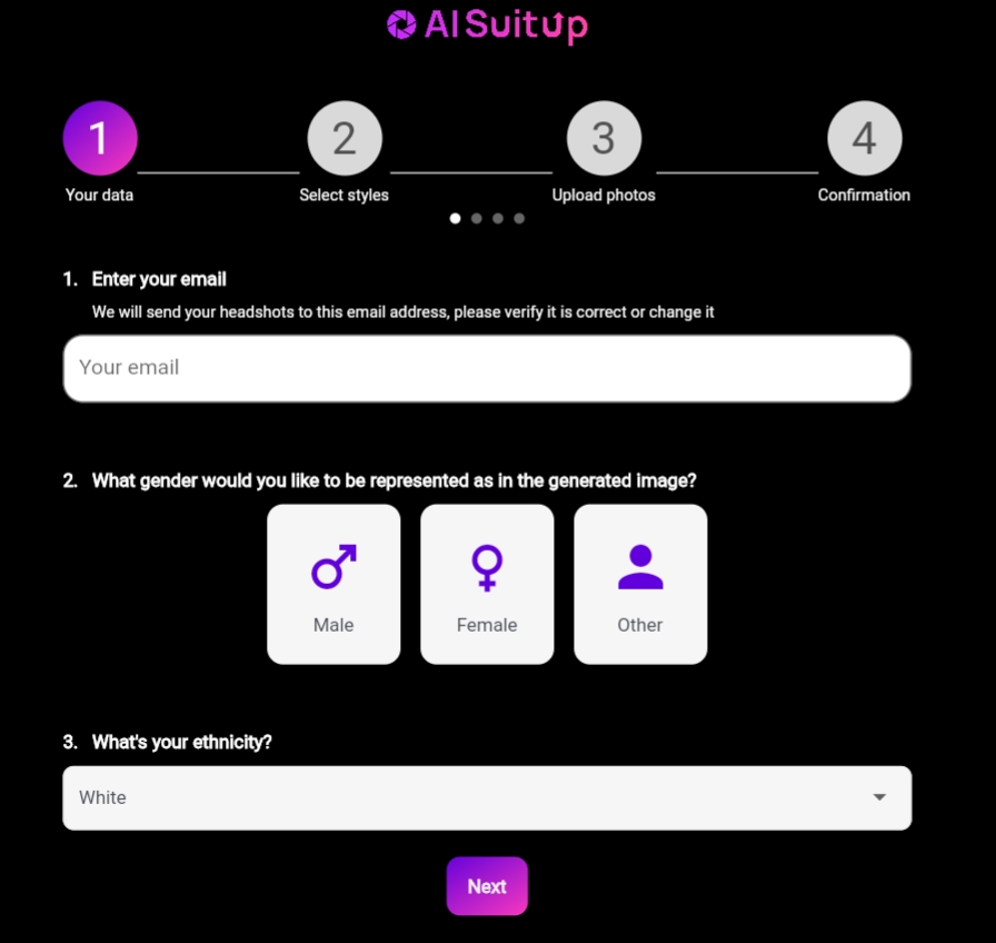 AI SuitUp is an AI headshot generator that transforms your selfies or regular pictures into polished, professional headshots. You simply upload your images, choose your preferred style, and within minutes, AI SuitUp generates dozens of variations that look like they were taken by a pro photographer.
