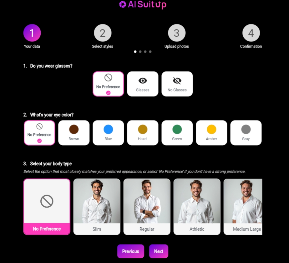Fill in your email, gender (for output images), ethnicity, and traits like glasses, eye color, body type, hairstyle, and hair color. This helps the AI tailor realistic results.