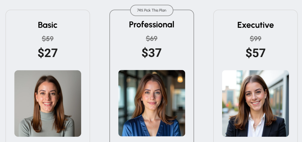 Offers more headshot variations, suitable for professionals who want multiple styles. - Executive Plan – $57