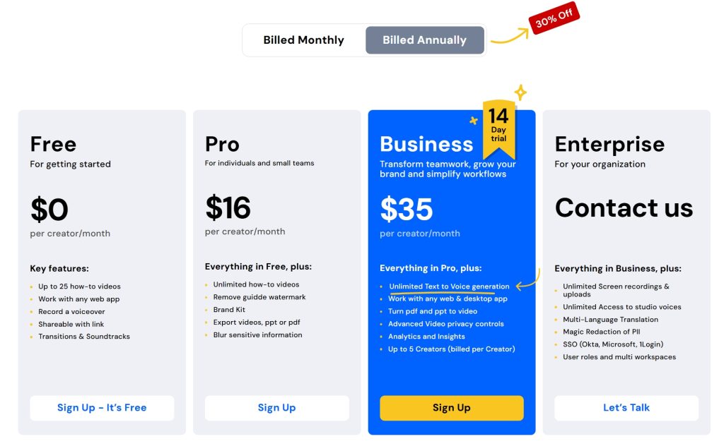 Guidde offers flexible plans to fit individuals and organizations alike:
