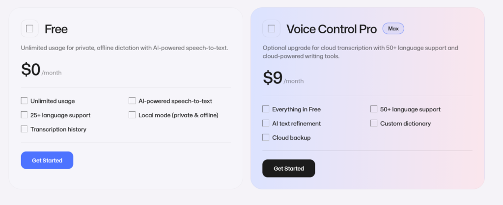 Voice Control Pro offers a flexible pricing model to suit the needs of different users. The Free plan allows unlimited offline dictation with AI-powered speech-to-text, 25+ language support, and full privacy in local mode.